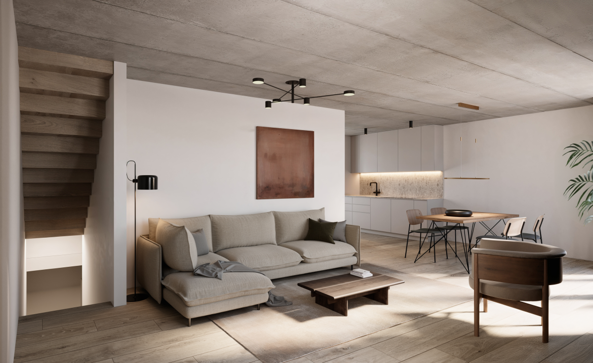• Edler Eichenparkett, Sichtbetondecken & fein abgestimmte Materialien